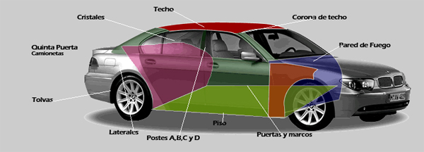 Todo el habitáculo del vehículo, corona de techo, puertas, espaldar, pestañas, salpicaderas, pared de fuego, parte trasera completa, marcos de puertas.