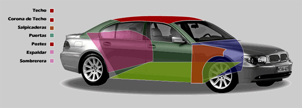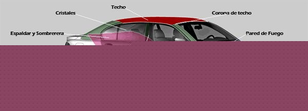 Todo el habitáculo del vehículo, techo, corona de techo, puertas, espaldar, pestañas, salpicaderas, pared de fuego, parte trasera completa.